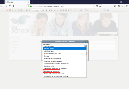 Wählen Sie unter Platzhalter Schulkalender einbinden aus.
